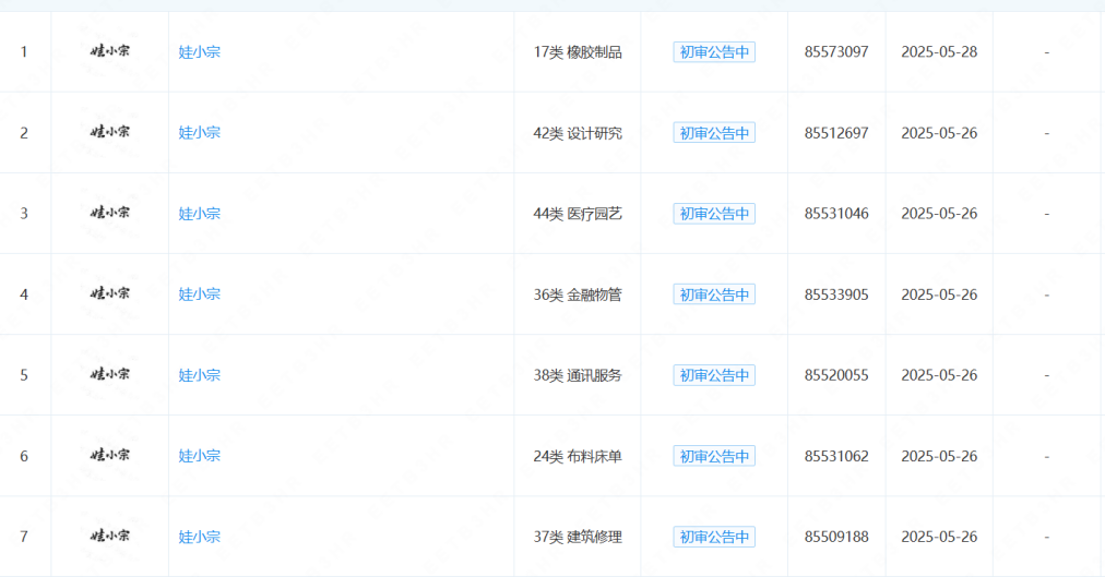 娃小宗申请了多个品类的商标