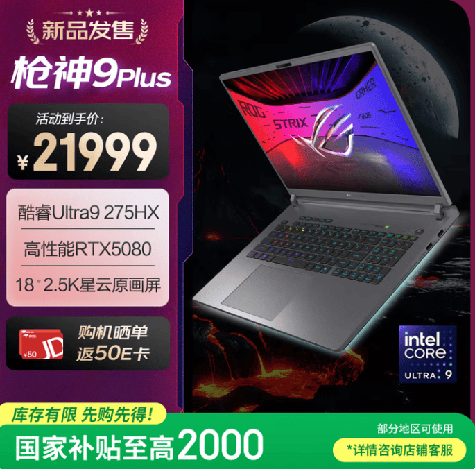 点评: 而对于预算非常充足,对价格完全不敏感,且对品牌知名度、机身做工要求极高的小伙伴,ROG枪神9 PLUS了解一下。款机型搭载的是Ultra 9 275HX+RTX 5080核心硬件组合,其采用双二代液金+三风扇内吹+端到端均热板散热模组,整机性能释放是非常狂暴的255W,性能表现非常能打。同时ROG的性能模式切换易用性是比较不错的,使用方便不复杂。该机屏幕则是18英寸的2.5K 240Hz屏,100%P3色域,支持双显三模以及四种色域切换,对于有创意设计类应用需求的用户来说更能满足色准需求。标配的存储搭配确实需要吐槽——都两万元的售价了还是单配16GB的内存,这点儿多少显得有些抠。机身造型很炫酷也很有辨识度,ROG大眼LOGO加环绕RGB底盘灯。接口方面,规格已经拉满:双雷电5接口搭配3个10Gbps速率的USB-A,HDMI也是48Gbps带宽,RJ45是2.5Gbps速率,还有Wi-Fi7无线网卡,算是当下游戏本的满配接口典型代表,电池容量90Wh。这款机型的硬实力还是相当扎实的,当然要完全发挥实力,你到手之后还是得花个相对于机身价格0.015%的价格去升级一下内存……